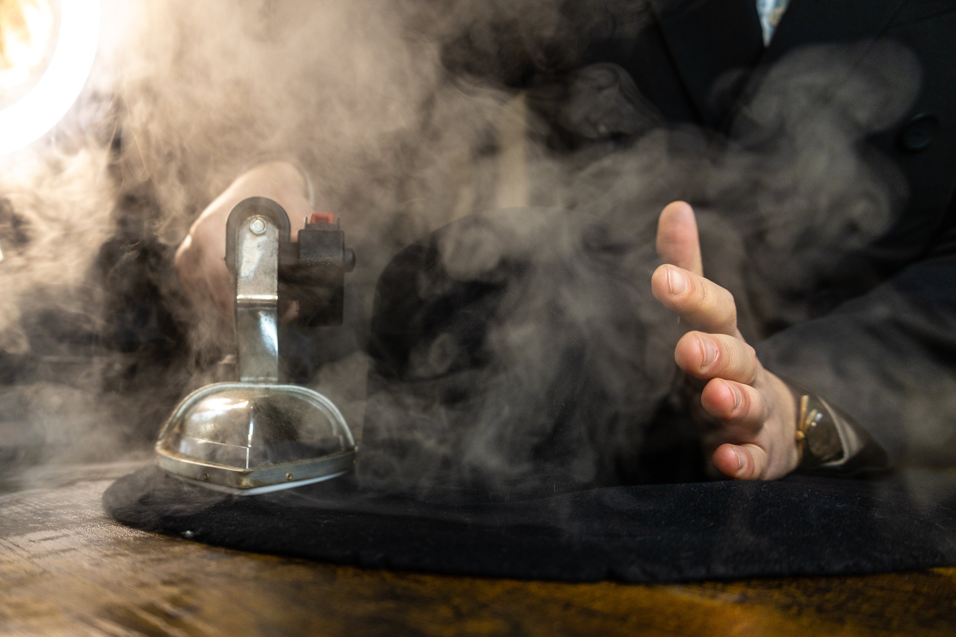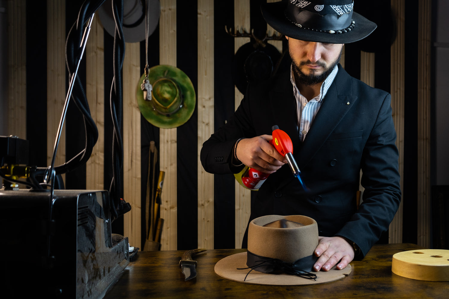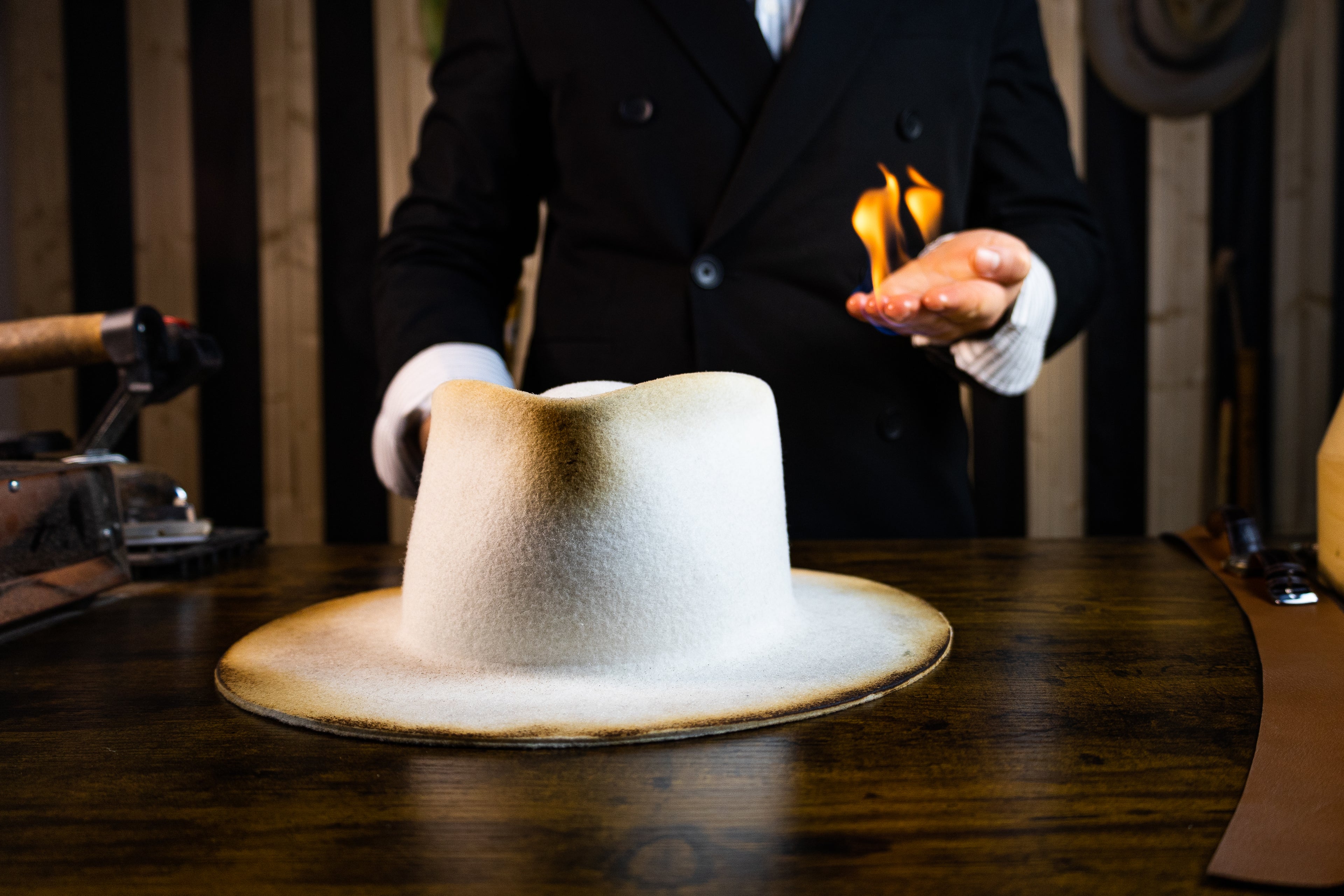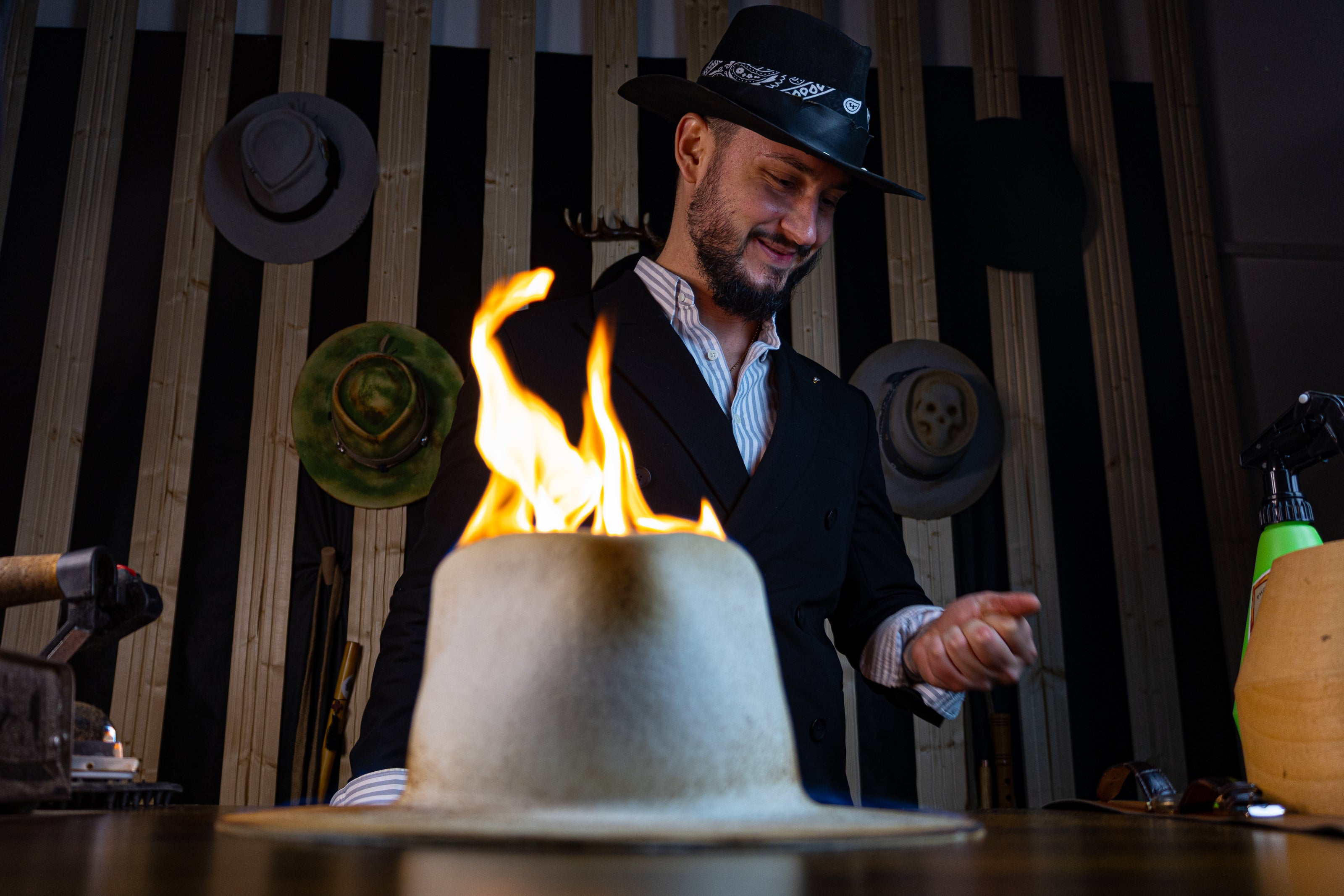 @storyhats.atelier “The burning blackjack strikes again” - Custom hat, handmade, step by step creation process ❤️🔥 - beaver 50%, rabbit 50% fur felt - calf leather band 🐄 - deer leather braided strings - blackjack cards - cigar #customhat #millinery #hatmaker #hatmaking #fedorahat ♬ original sound - storyhats