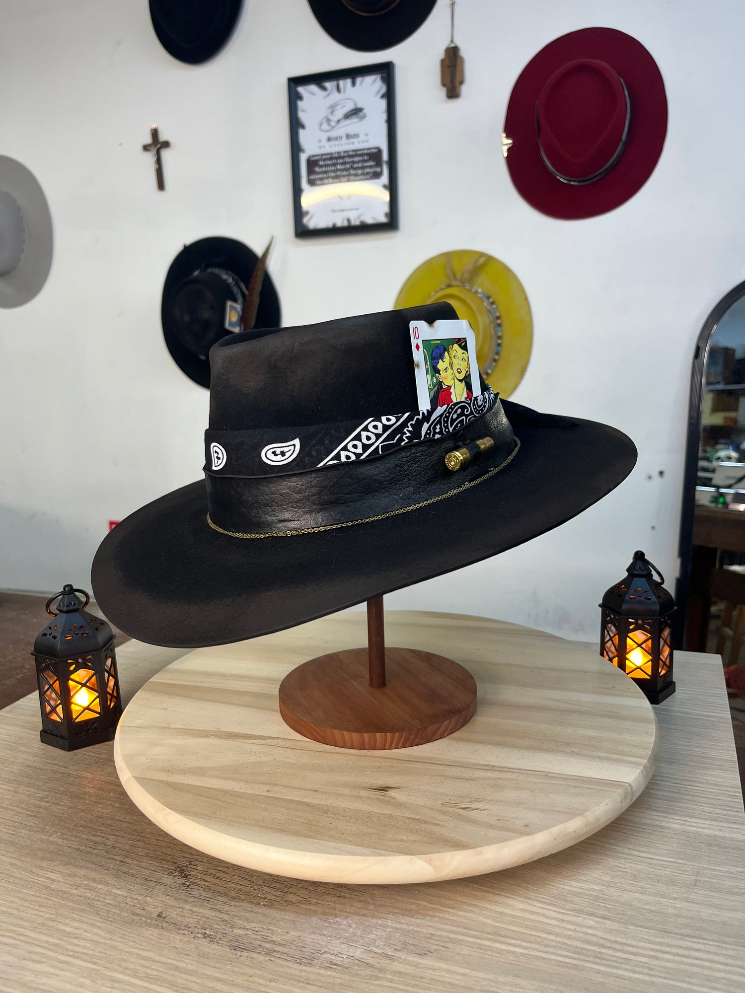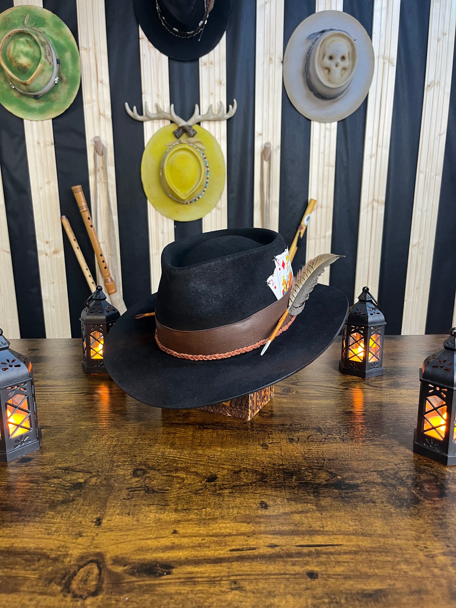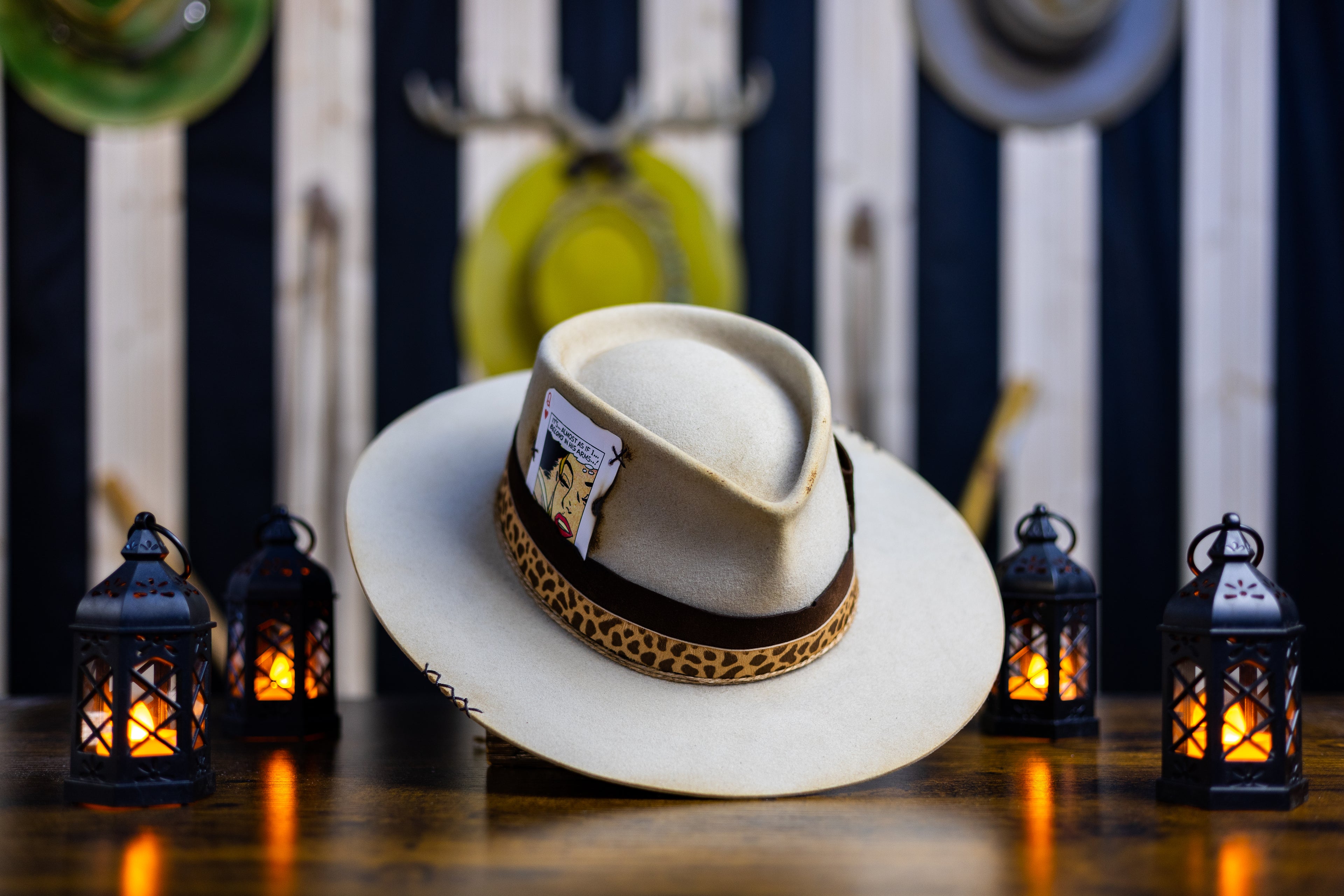 Tucked into the band is a playing card - the 10 of Diamonds, embodying a man who is kissing his love on the neck, hinting at chance, risk, and the romance of the unpredictable. It’s a subtle nod to luck and loyalty, to wins earned and losses accepted with grace.