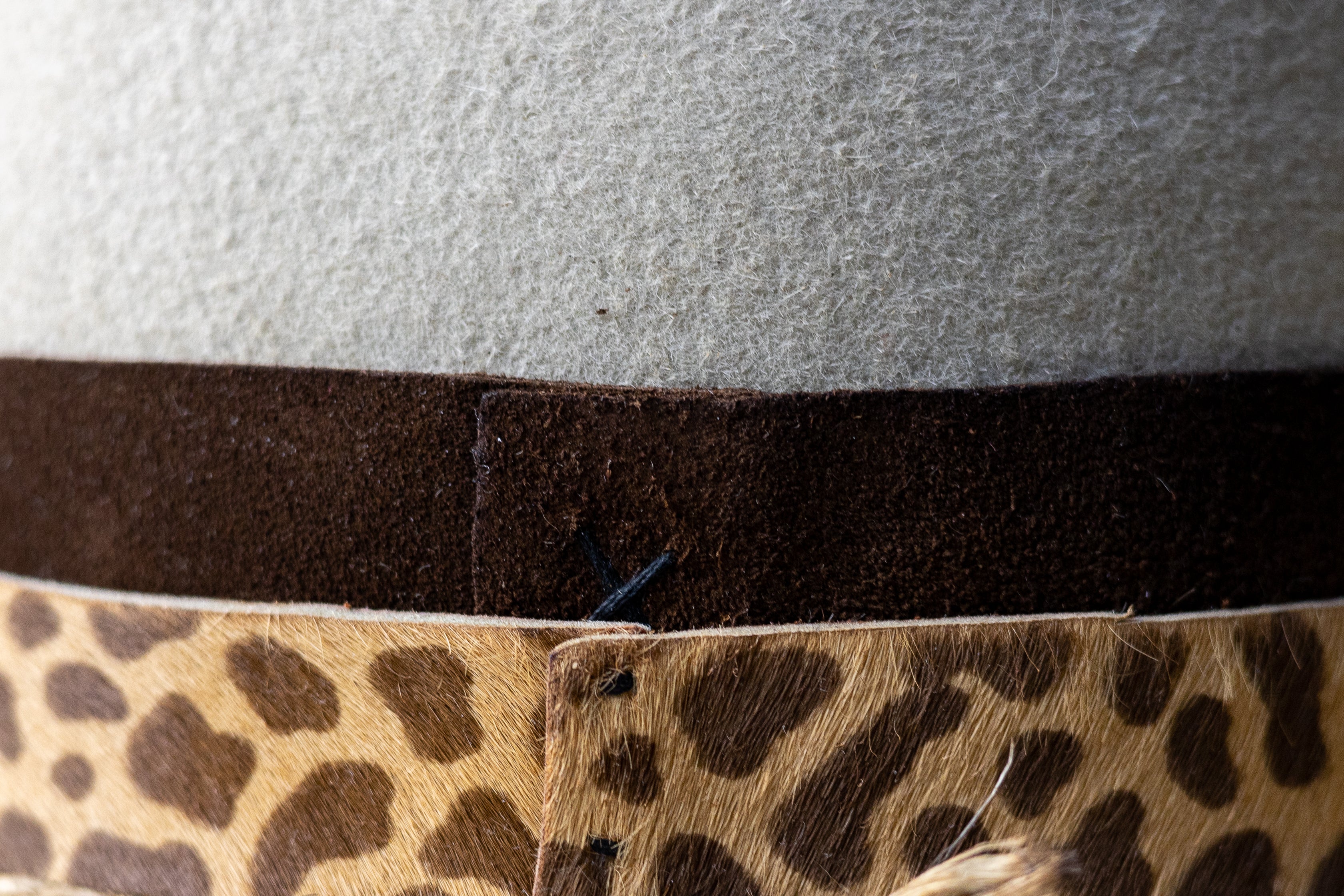 This hat carries the presence of something lived-in, something earned. Its muted, weathered tones - soft greys, earth browns, and smoke-dark shadows - tell a story of open landscapes and slow-burning sunsets. The wide brim is shaped with intention, offering shade not just from the sun, but from a world that moves too fast for those who choose their own pace.